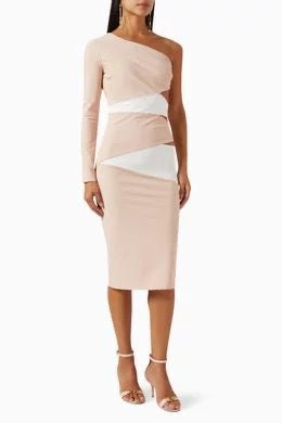 Where to Wear: Elegant one-sleeve design with diagonal pink, white, and beige panels. Fitted silhouette hits below the knee. Ideal for weddings, cocktails, or date nights.