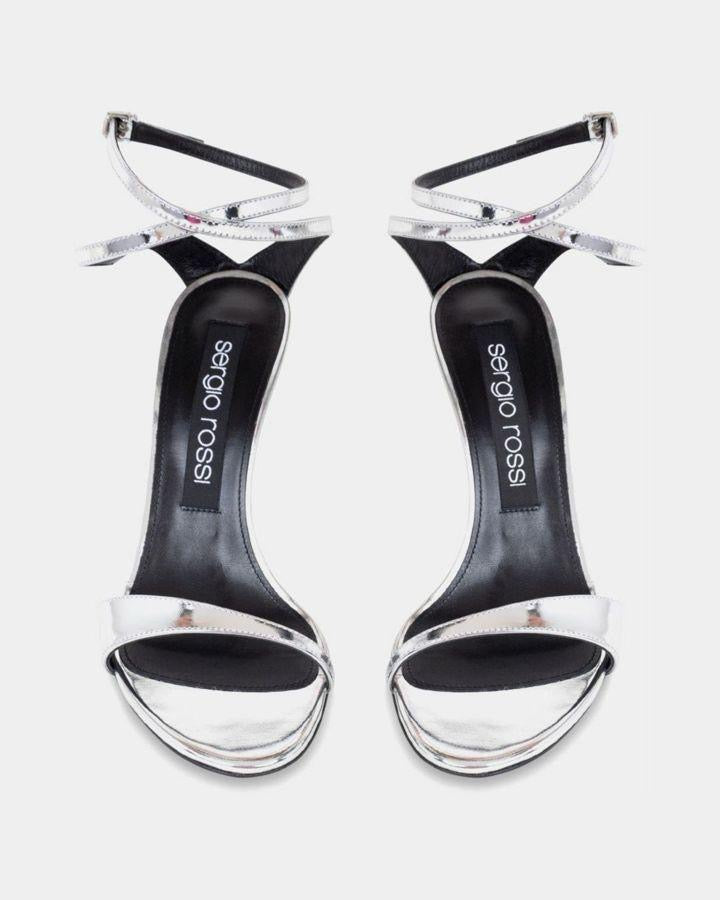Where to Wear: Silver metallic leather sandals with thin ankle strap and minimalist design. Features open toe, slim straps, and mid-height stiletto heel. Ideal for evening occasions, weddings, formal events, or adding sleek metallic sophistication to cocktail dresses and elegant ensembles.