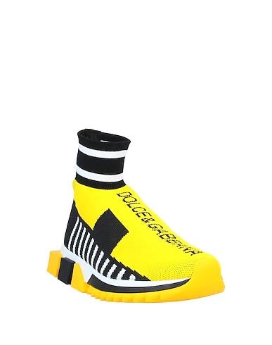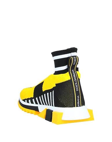 Where to Wear: High-top sock sneakers in neon yellow, black, and white striped knit. Features chunky color-blocked sole and striped ankle cuff. Ideal for streetwear styling, casual outings, or athleisure looks.