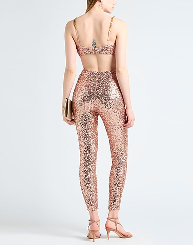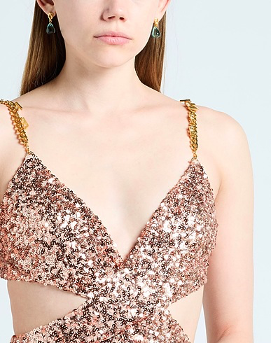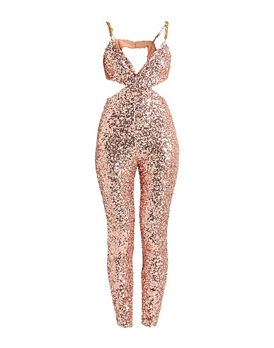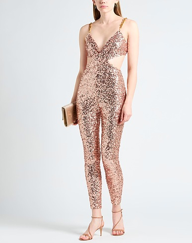 Dazzling all-over sequin jumpsuit with waist cut-outs, open back, and gold chain straps. Sleek fitted silhouette catches the light for maximum impact.