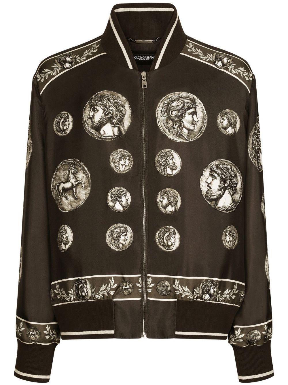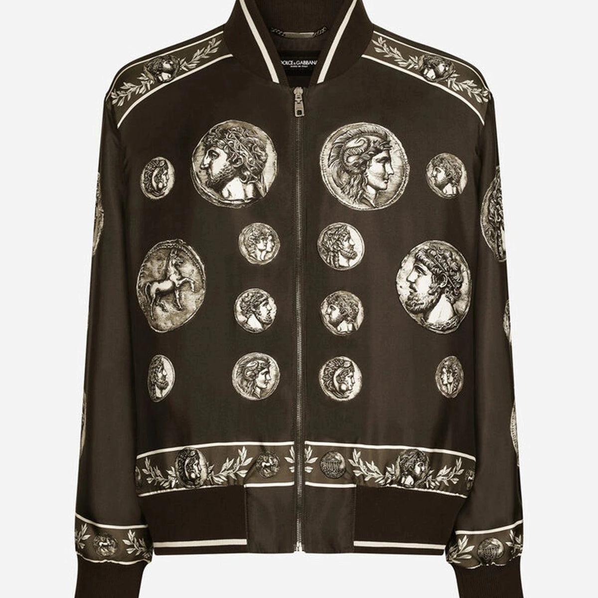 Where to Wear: Black silk bomber jacket with white ancient Roman coin print and laurel wreath trim. Features ribbed collar, cuffs, and hem with contrast piping detail and full zip closure. Ideal for elevated casual occasions, art gallery openings, sophisticated evening outings, or adding classical luxury to contemporary streetwear.