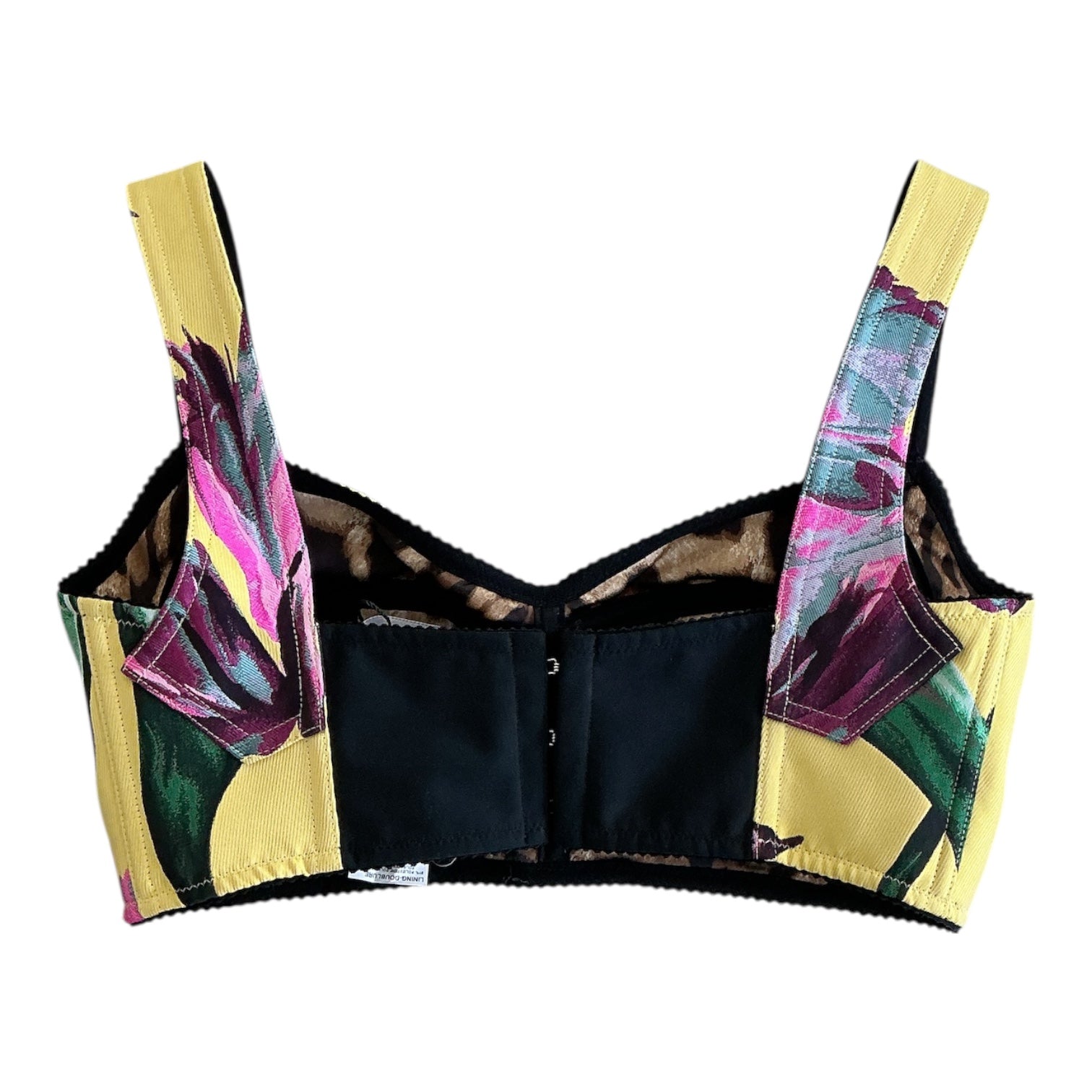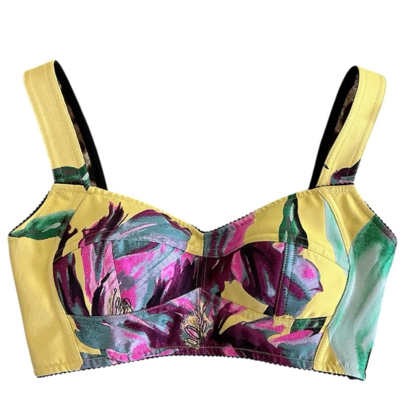 Vibrant floral print bustier with structured boning and wide straps. Bold painterly design creates an artistic, fashion-forward statement piece.