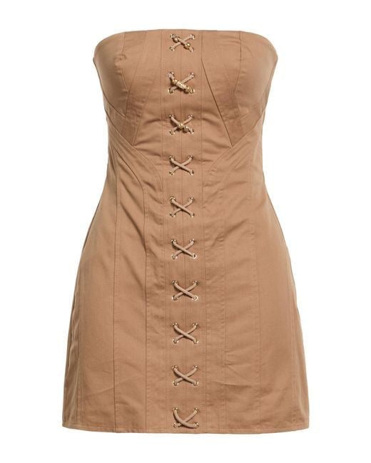 Where to Wear: Camel strapless mini dress with structured corset bodice and center-front gold-tone lace-up hardware. Features boned construction for support, fitted silhouette, and paneled design for enhanced shape definition. Ideal for summer parties, date nights, cocktail events, vacation dinners, or making a statement at special celebrations.