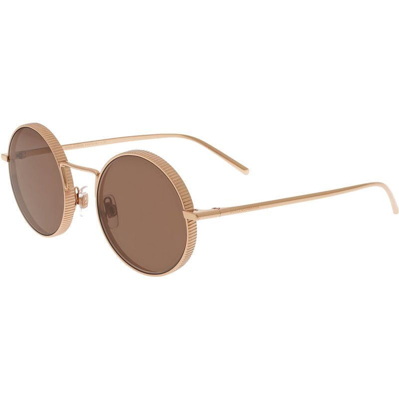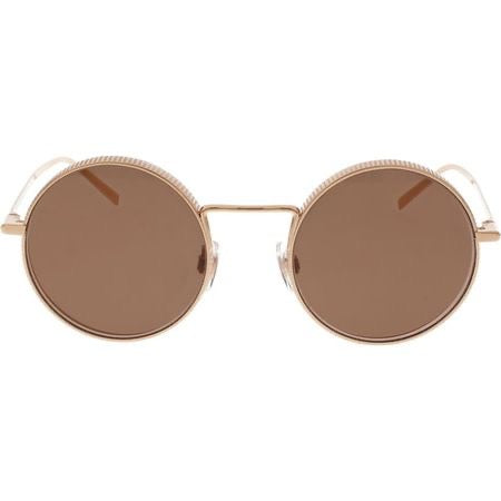 Elegant round metal-frame sunglasses with ribbed detailing and warm-toned lenses. Comes with a signature ribbed fabric case with gold logo plaque.