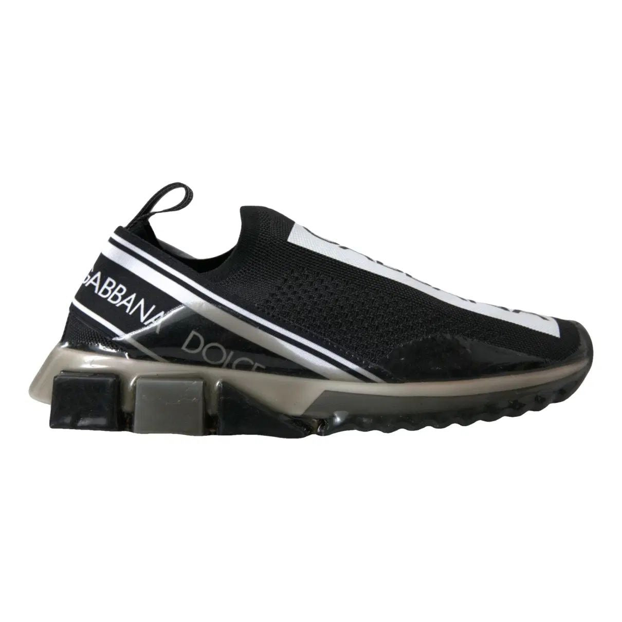 Where to Wear: Black slip-on sneakers with bold white “DOLCE & GABBANA” logo panels across the elasticated upper. Sock-like construction with pull tabs at heel for easy wear. Chunky white rubber sole with black tread detailing provides comfort and modern sporty aesthetic. Perfect for casual everyday wear, travel, running errands, or pairing with athleisure looks. Style with joggers, leggings, jeans, or casual dresses for effortless cool.
