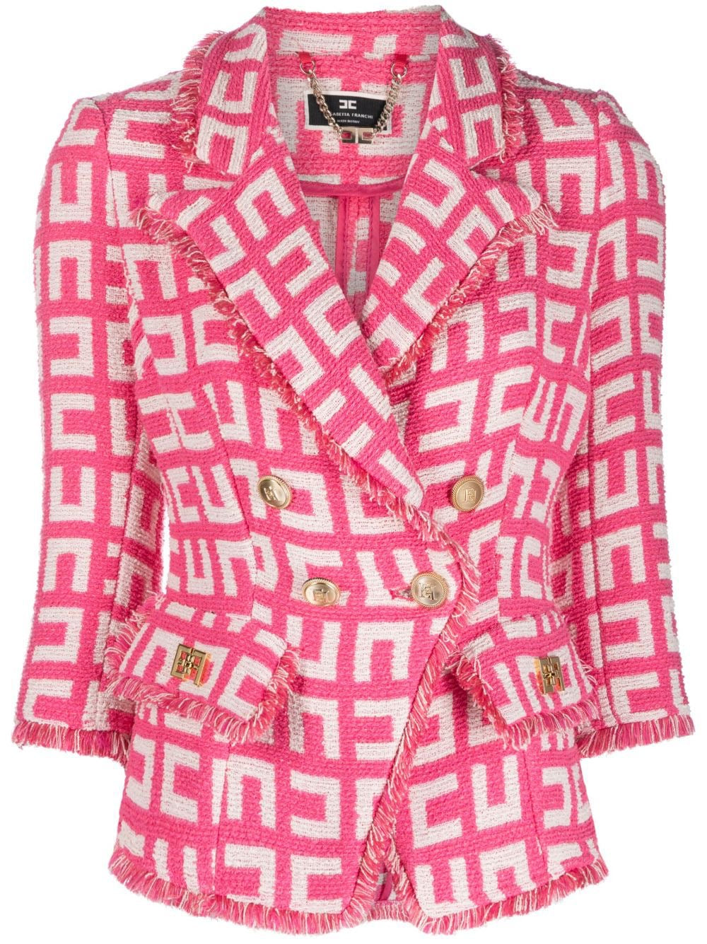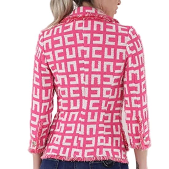Where to Wear: Pink and cream geometric logo pattern blazer with frayed edge detailing. Double-breasted with gold buttons and three-quarter sleeves. Ideal for fashion lunches, creative workplaces, or statement-making events.