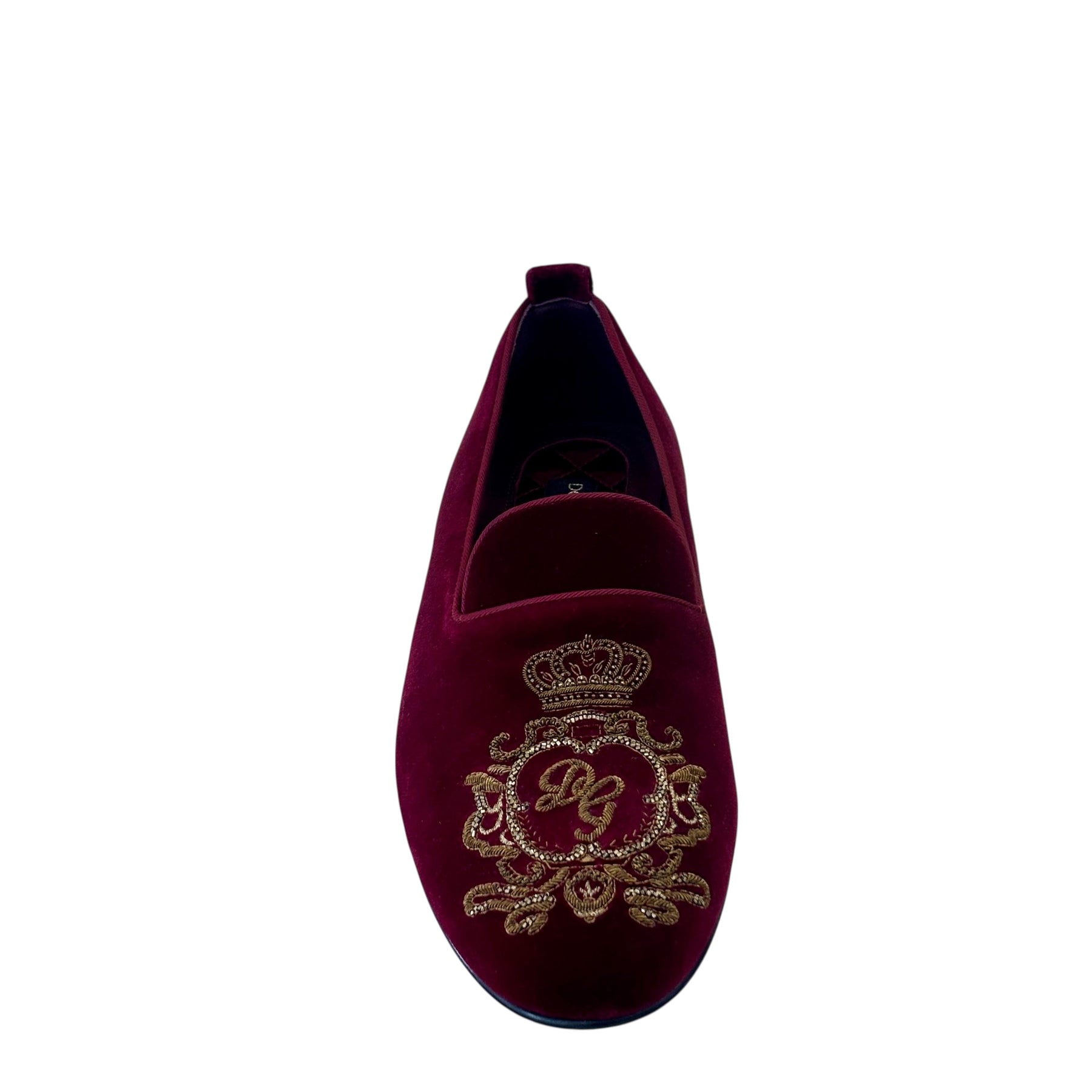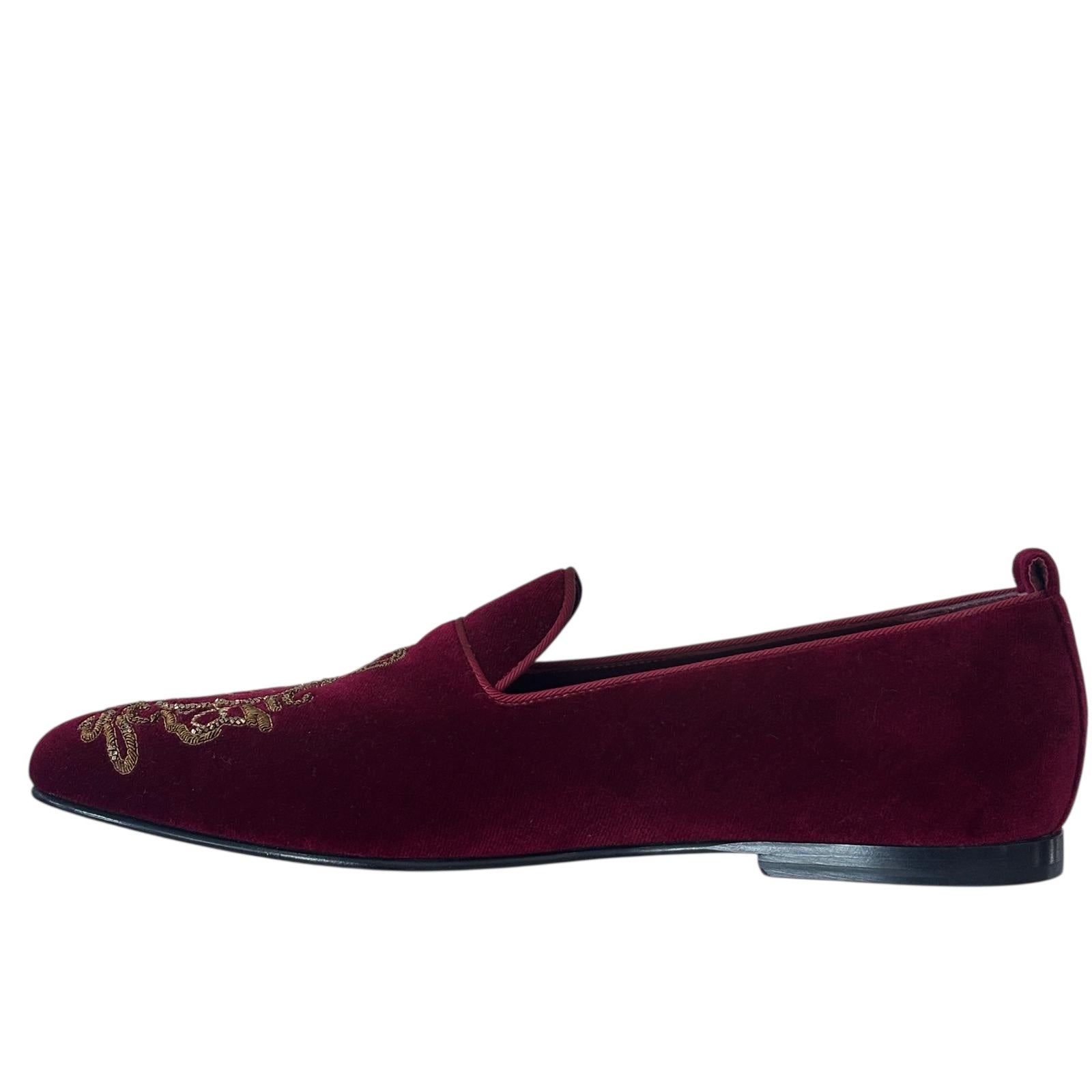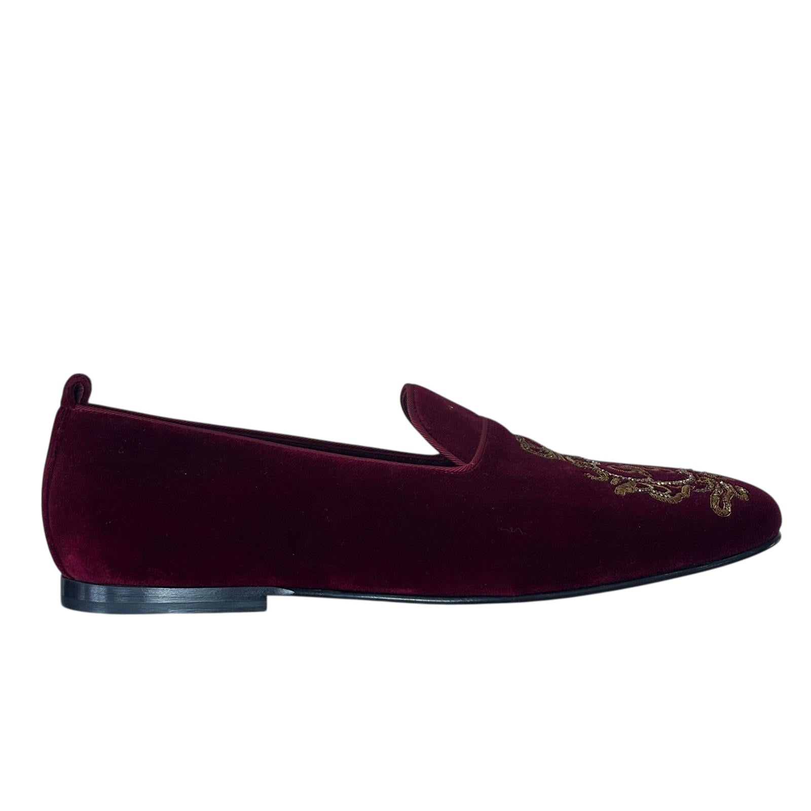 Velvet Loafers with Gold Embroidery. Luxurious velvet smoking loafers featuring intricate gold baroque embroidery. Rich fabric and ornate detailing create a regal, sophisticated statement.